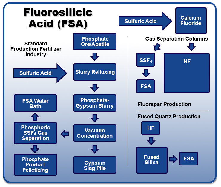 Fluorosilicic acid (FSA) production is represented in this flowchart. Apatite is refluxed (mixed and heated) with sulfuric acid resulting in a phosphoric acid-gypsum slurry. This is the starting point for making pelletized phosphate fertilizers. The gypsum, calcium sulfate, produced from this process is the material used to manufacture drywall or sheetrock. This process also releases silica tetrafluoride and hydrogen fluoride, which are dissolved gases in the gypsum slurry. These gases are vacuum extracted along with the phosphoric acid gas. The gases are separated, and the fluoride gases are condensed into the FSA mixture used for water fluoridation.