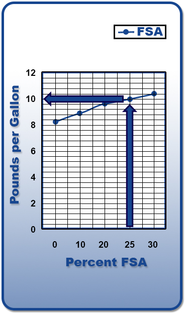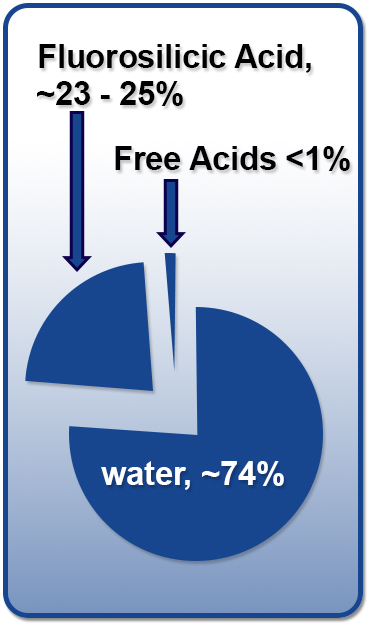 Fluorosilicic acid (FSA) has a solution pH of 1.2 and is corrosive. Care is needed when handling it. It is the most commonly used fluoride additive. It is commercially available in solution concentrations ranging from 20% to 35% with a typical solution concentration of 23% to 25%. The density of a 25% acid is 10.1 pounds per gallon, which is more than the 8.34 pounds per gallon that water weighs. The chart shows how the density of the FSA increases as the concentration of the acid increases. Since other constituents in the water such as phosphoric acid, sulfuric acid, and other acids can affect density, it is important to use the AWWA Fluorosilicic Acid Standard method of hydrogen titration. That method converts fluorosilicates to potassium silicates, and then measures the quantity of sodium hydroxide required to neutralize the resulting hydrogen in the solution.