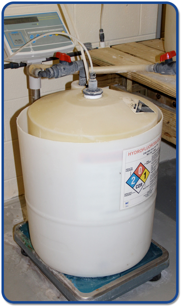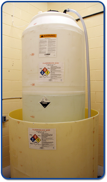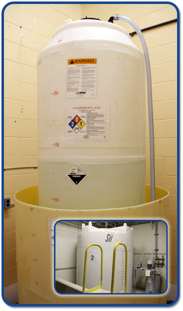 Because fluorosilicic acid (FSA) is liquid it is important to have spill containment for 110% volume (double-walled tank or barrier). If concrete is used, a protective coating should be applied to minimize acid attack on the concrete in the event of a spill. Check with your coating supplier, but normally an epoxy undercoating with a top coat of urethane will be satisfactory.