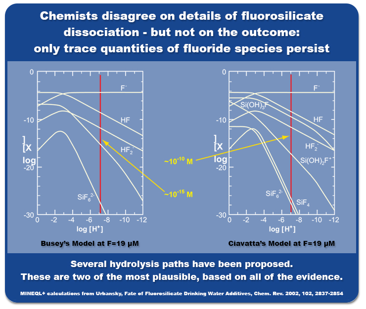 Each of these models uses a concentration of 1 mg of fluoride per liter of water. In Busey’s model, the maximum fluorosilicate concentration would be ten-to-the-fifteenth. In Ciavatta’s model, the maximum fluorosilicate concentration would be ten-to-the-tenth. These are much less than a part per billion and even lesser than a part per trillion.