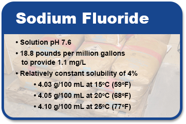 Sodium fluoride was the first compound used for water fluoridation, and its physiological and health effects have been thoroughly studied. Sodium fluoride is a white odorless salt. It is the ideal additive for use with saturators for small systems because of its relatively constant solubility. It also dissolves readily and can achieve a saturated solution within 5 minutes.
