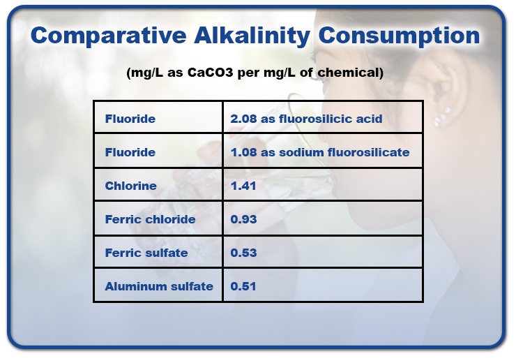 Water typically has both carbonate buffering mixed with silicate (sand) buffering. Fluorosilicates consumes a portion of the solution by weight. But considering the low concentration of fluorosilicate relative to other alkalinity consuming anions, the relative amount of alkalinity consumed by fluoride is quite small. Chlorine and the coagulants are typically applied at a dosage 10 to 50 times the dosage of fluoride. Sodium fluoride does not consume alkalinity buffering.
