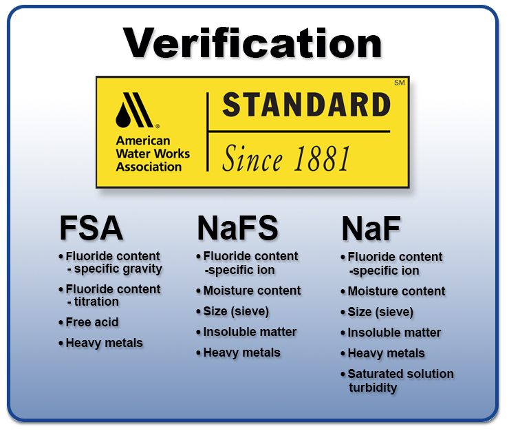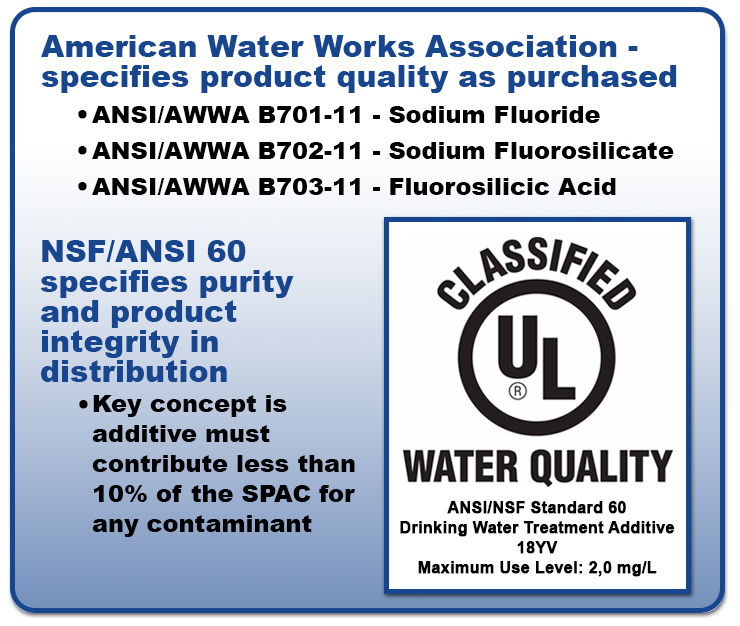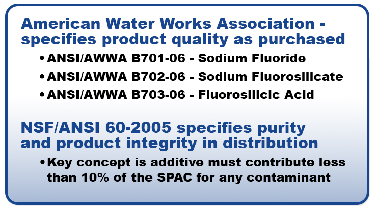 There are standards you should be aware of for fluoride additives. The American Water Works Association (AWWA) specifications cover the fluoride additives product quality as purchased. There is a separate standard for each additive, and all facilities should have the AWWA standard for the additive they use to adjust fluoride. NSF International/American National Standards Institute (NSF/ANSI) standard covers product quality for impurities and product integrity in distribution.