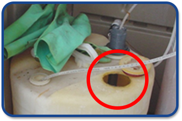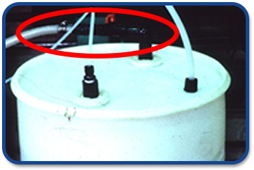 Venting is an important consideration when setting up a day tank. A properly sized tank with sufficient wall thickness should be used. 55 gallon drums have a wall thickness that is too thin. The top photo shows a drum venting with a flexible hose. The middle photo is a tank not correctly vented to the outside. The bottom photograph demonstrates corrosion in the vicinity of an incorrectly vented tank. Ensure that a tank is sealed and vented to the outside and that it does not release within the building.