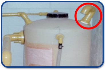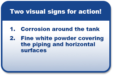 If a tank is poorly vented, or if there is a leak in the vent piping, there are two visual signs that will indicate that the operator should take action. The first is evidence of corrosion in the vicinity of the tank, and the second is a fine white powder covering the piping and other horizontal surfaces. This white dusting is silica resulting from decay of the silica tetrafluoride gas in fluorosilicic acid (FSA).
