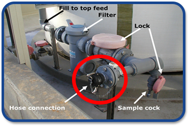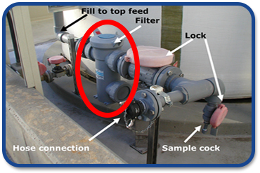 Since debris acquired during transport and deterioration of the rubber lining of the transport tank is the most frequently observed problem with fluorosilicic acid (FSA), it is advisable to have a filter on the bulk tank feed line. Here is an installation showing the hose connection (lockable) and an in-line basket filter so if the delivery truck has debris, most of it will not enter the tank.